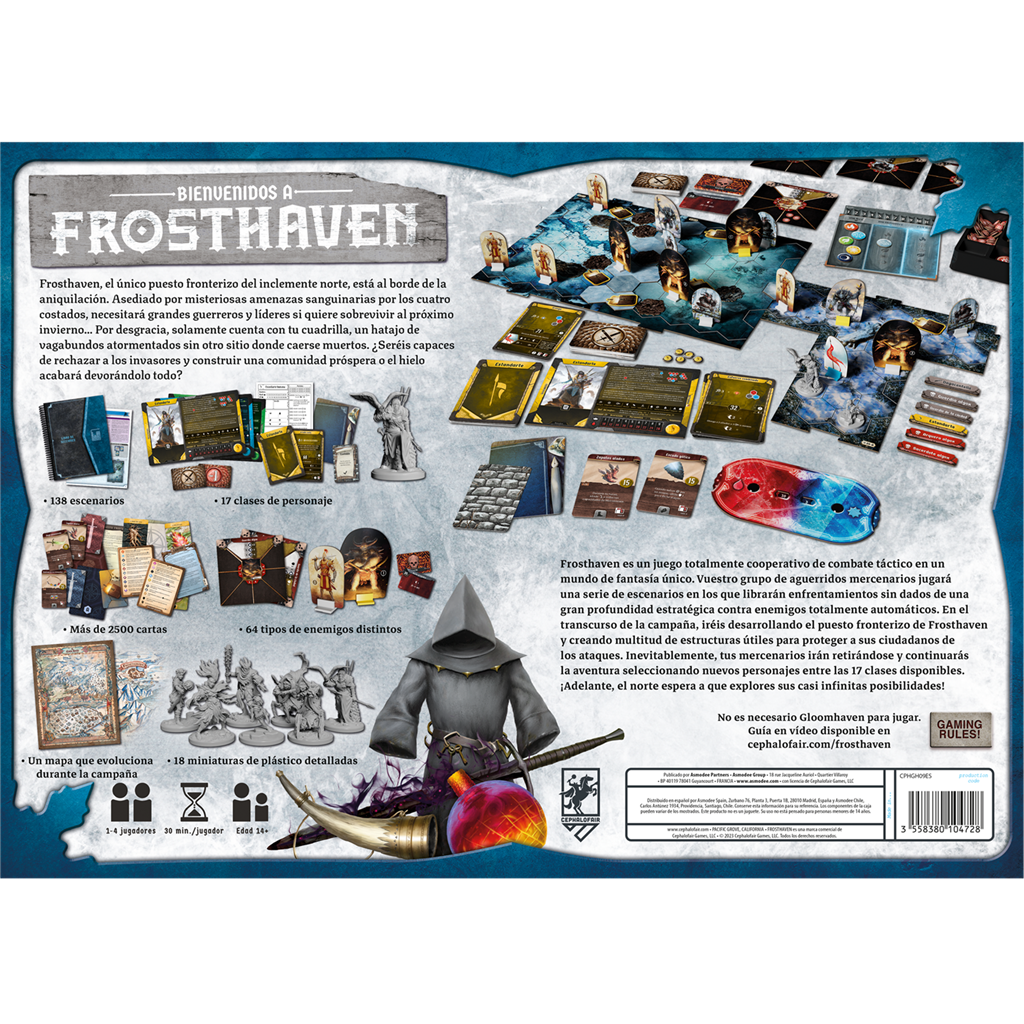 Frosthaven es un juego totalmente cooperativo de combate táctico en un mundo de fantasía único. Vuestro grupo de aguerridos mercenarios jugará una serie de escenarios en los que librarán enfrentamientos sin dados de una gran profundidad estratégica contra enemigos totalmente automáticos. En el transcurso de la campaña, iréis desarrollando el puesto fronterizo de Frosthaven y creando multitud de estructuras útiles para proteger a sus ciudadanos de los ataques. Inevitablemente, tus mercenarios irán retirándose y continuarás la aventura seleccionando nuevos personajes entre las 17 clases disponibles.